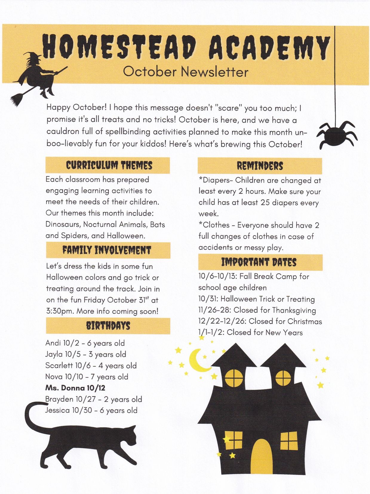 Here at Homestead Academy we believe every child is unique and amazing. Children learn best through play and interaction with the world around them. We are committed to providing a safe, fun, loving environment for your child where he/she can grow and become their best self.