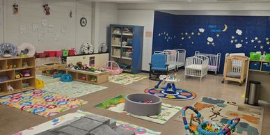 Our infant room provides a nurturing and stimulating environment for babies, focusing on developmental milestones, care routines, and creating a safe, secure space for infants to thrive. You will see that each child has their own crib, there is a dedicated space for non-mobile infants, and plenty of space for the little ones who are ready to crawl, climb, and learn to walk.
