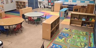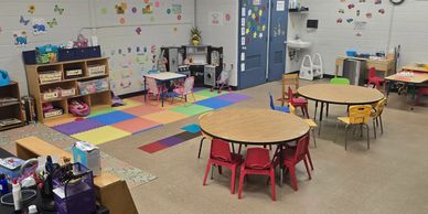 Our older toddler room is set up for learning and fun! This room contains a diaper changing area and a bathroom to promote potty training.